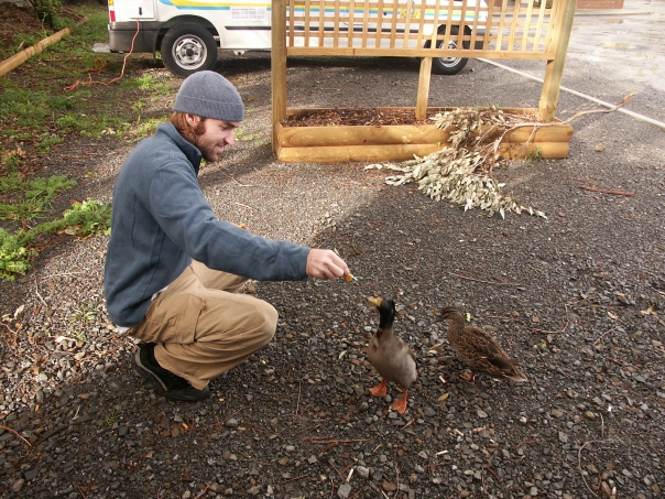 YOUNG MAN WEARING BLUE SKULL CAP, BLUE JACKET AND TAN PANTS IS KNEELING DOWN TO FEED THE DUCKS.