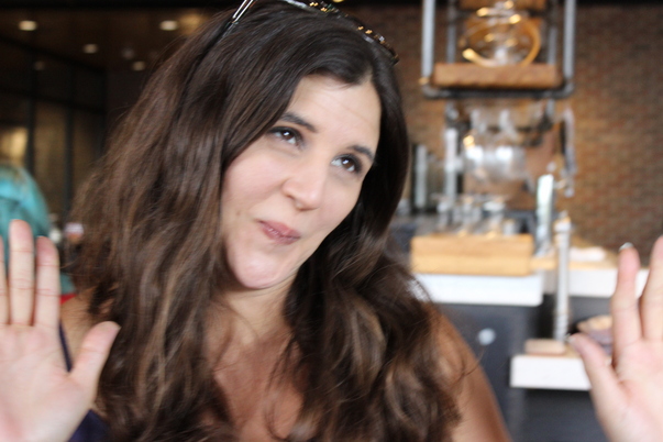 A young woman with brown hair holding up her hands and puckering her pink lips.