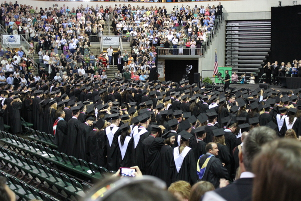 There are a lot of people that are seated for the graduation they are wearing black gowns and caps
