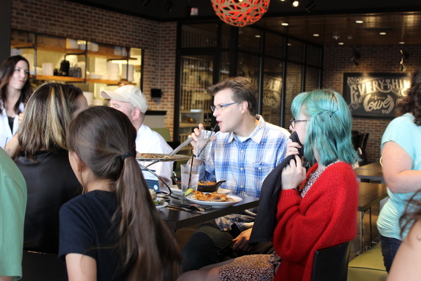 A family surrounding a dinner table in a busy restaurant environment.