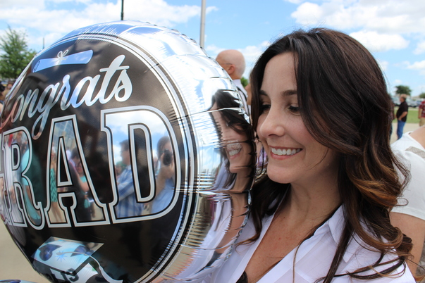A brunette woman smiling and holding up a silver balloon that says Congrats grad.