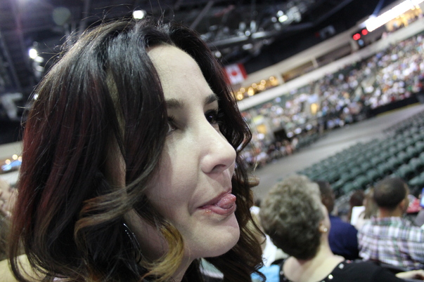 An ombre haired woman is playfully sticking out her tongue while attending an event at a large arena.