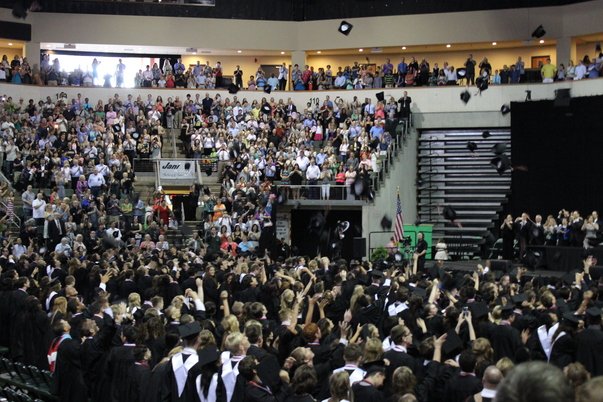 The graduates are wearing black robes with white collars while the audience members are packed to the rafters.