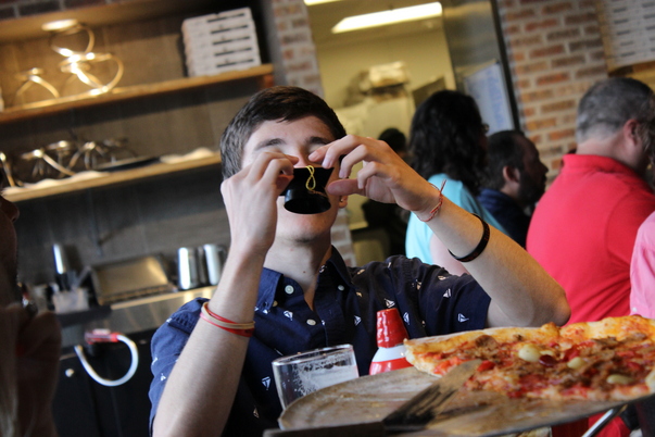 A young male shows off a small trinket while enjoying a pizza at a parlor.