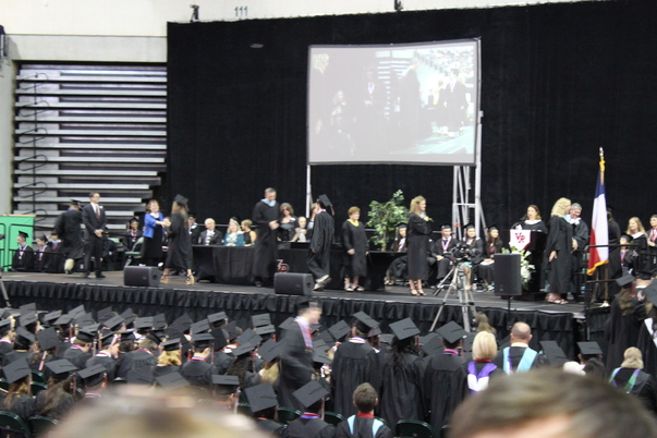 There are a group of graduates that are standing on the stage wearing a black gown and black cap