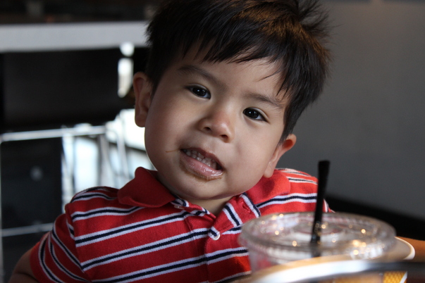A young boy pauses with a smile as he enjoys a cool beverage.