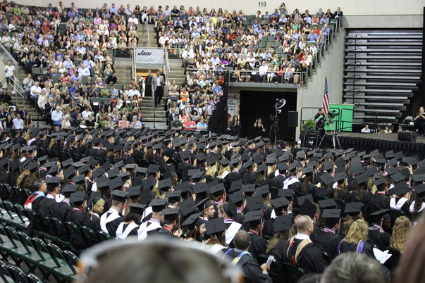 Rows and rows of graduating students in a packed auditorium, waiting for the ceremony to start.