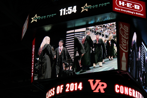 Television monitors showing college graduates dressed in black gownsreceiving their diplomas.