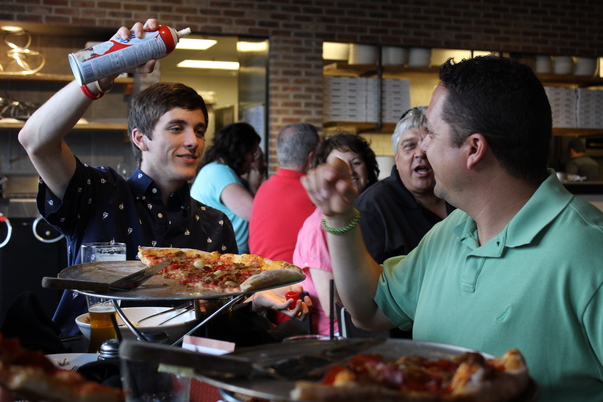 This is a group of people having dinner at a pizza place, and one young man is holding a bottle of whipped cream.