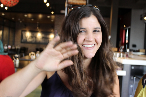 Picture of a smiling, brunette woman in a restaurant with her hand raised.