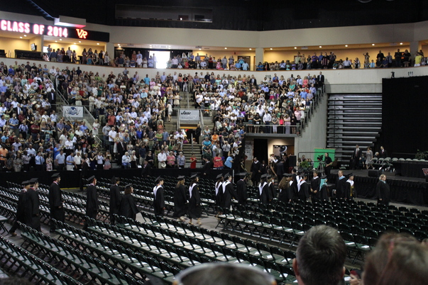 A distant shot of college graduates dressed in black walking to receive their diplomas.