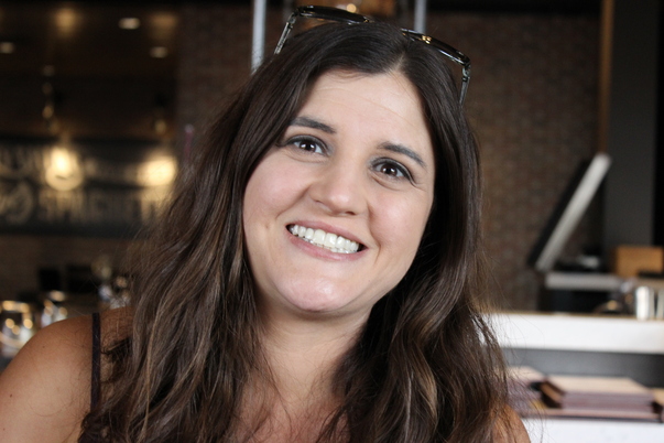A young woman with very white teeth and she has a radiant smile.