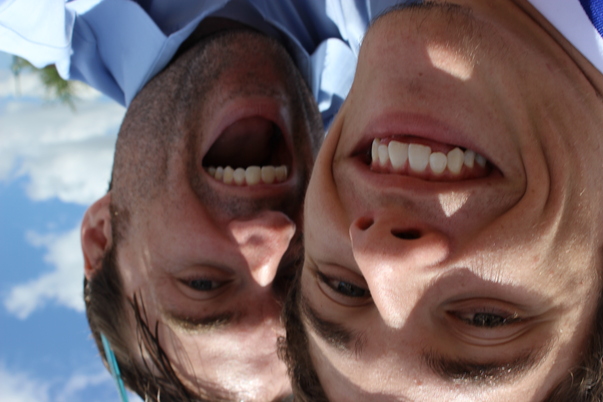 Upside down photo of two smiling men, with teeth prominently displayed.