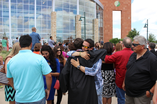 Happy graduates and their families congregate outside of the venue that hosted their ceremony.