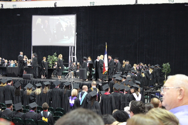 People are seated in the audience and graduated in black gowns and caps are marching on stage