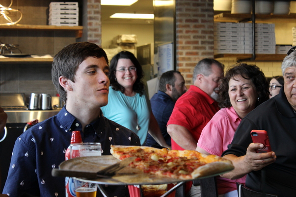 An unjustifiably pleased young man looks smug in a pizza restaurant as others look on.