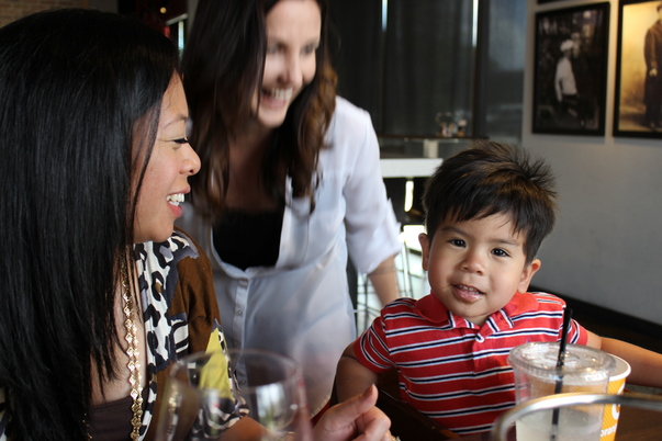 A young Asian boy in a red striped shirt smiles towards the camera while two young women smile at him.