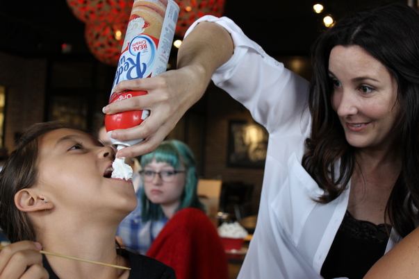 There is a woman that is pouring a can if redi whip down the throat of a little girl