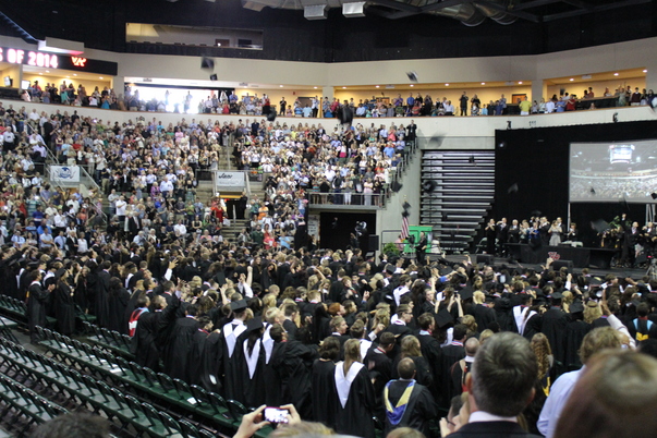 A graduation ceremony showing the whole student body in black robes.