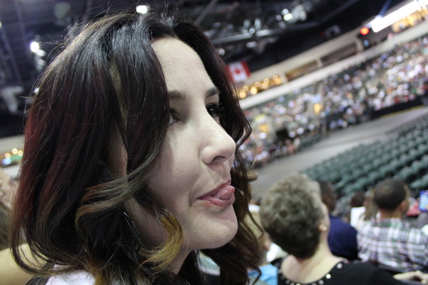 This brown haired young woman concentrates while waiting for the main event to begin in the auditorium.
