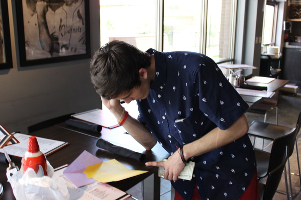 The person in the blue shirt and red pants is reading a yellow paper.