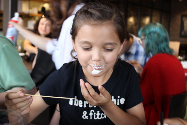 This is a little girl wearing an abercrombie & fitch shirt eating some sort of white frosting or cream.