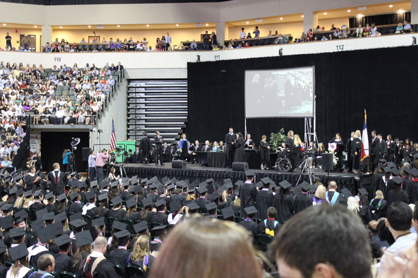 This is a graduation picture showing students in the audience and students walking across the stage.