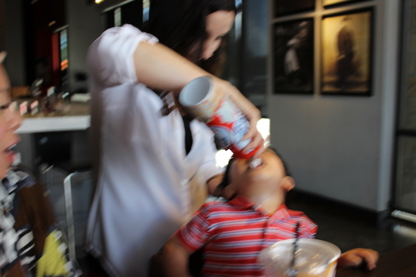 A woman in a white shirts sprays cream in the mouth of a child in a red shirt.
