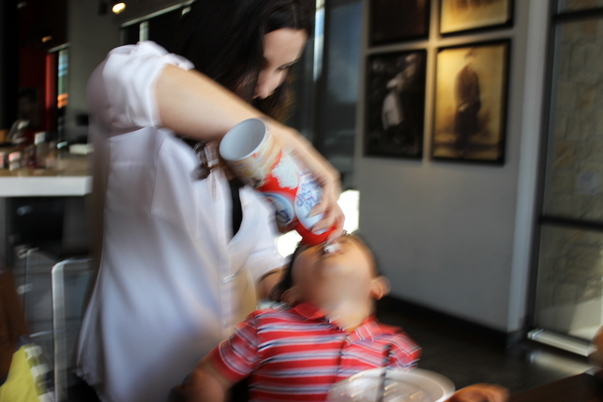 There is a lady feeding a child whipped cream in a red striped shirt.