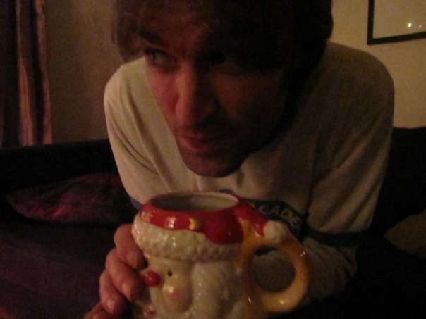 A man hunched over a Santa Clause cup with a large handle.