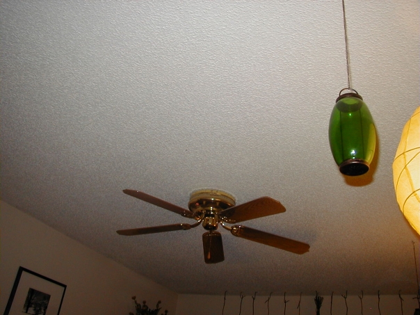 The photo shows the ceiling of a room that has a lamp and a ceiling fan |