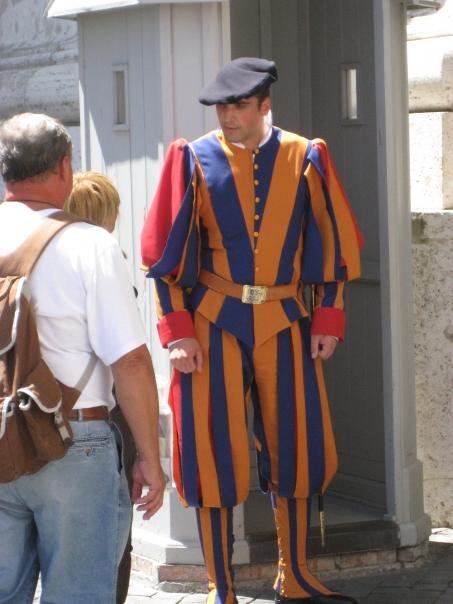 The red, blue, and gold of the uniform of the guard makes a colorful costume.