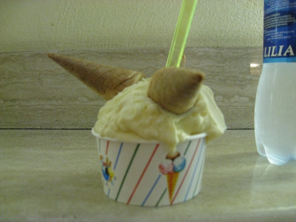 A strange looking type of icecream dish with the cones coming out of the top. There is a water bottle on the right side of the image.