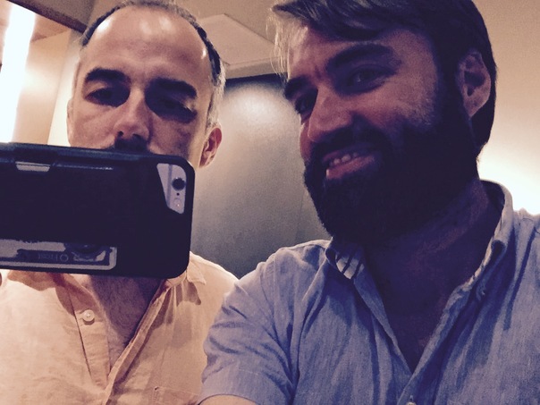a bearded man stares at some type of device next to another man holding it up.