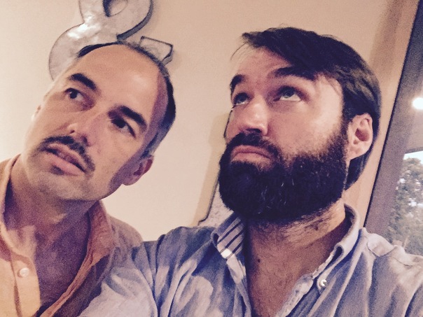 A doubtful pair of men pass judgement with unpleased expressions.