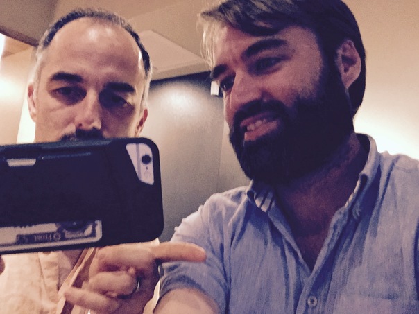 a bearded man stares at some device in a blue shirt next to another man who is pointing to the side.