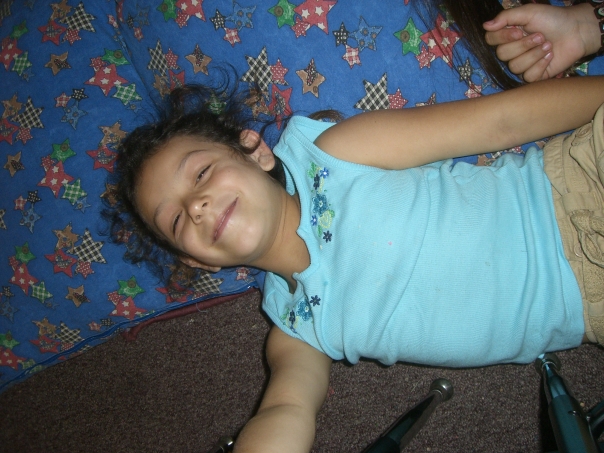 A pretty little girl smiles playfully as she lounges on the floor.
