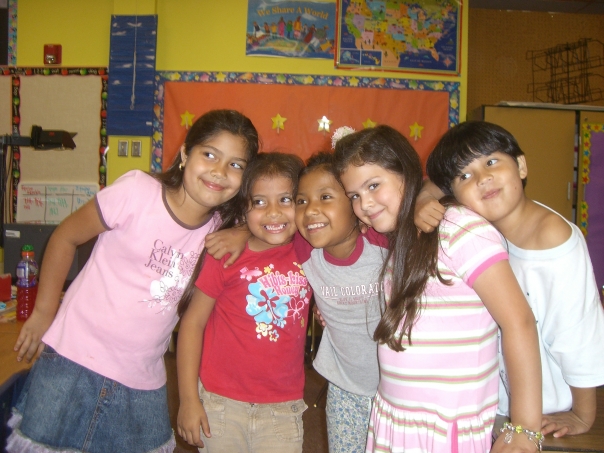 A group of children, most of whom are wearing some shade of pink or red, stand in an affectionate huddle in a classroom.