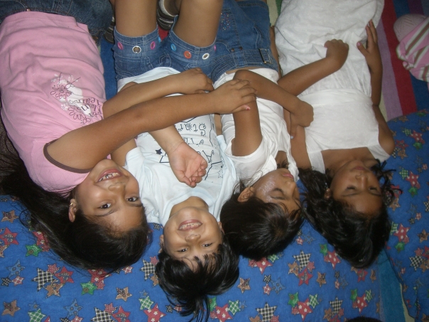 These four young children are lying down on a bed covered in blue sheets.