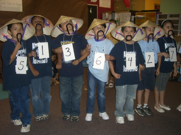 Seven children dressed in stereotypical Asian hats and facial hair holding nbwrs 1-7.
