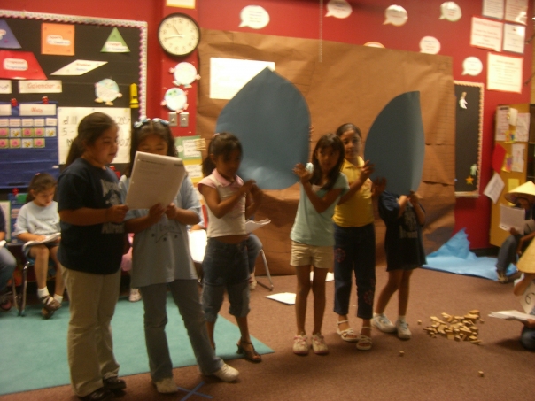 Several girls stand in a row, holding props and reading from a script, in their classroom.