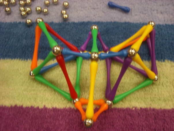 toy using gold magnetic balls connecting colorful plastic sticks on striped carpet