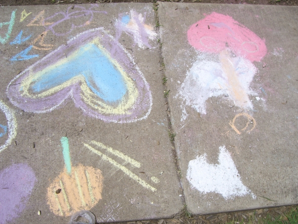 brightly colored chalk drawings of various sized hearts on a sidewalk