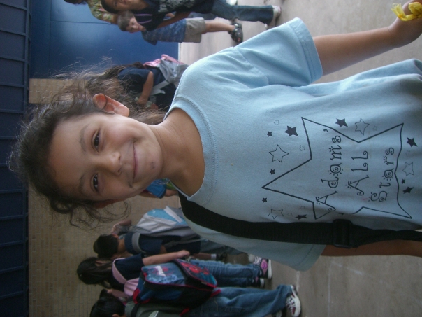 There is a young lady wearing a blue shirt that says Adams All Stars.