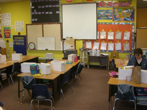 An indoor classroom scene where the desks are topped with white cardboard boxes.