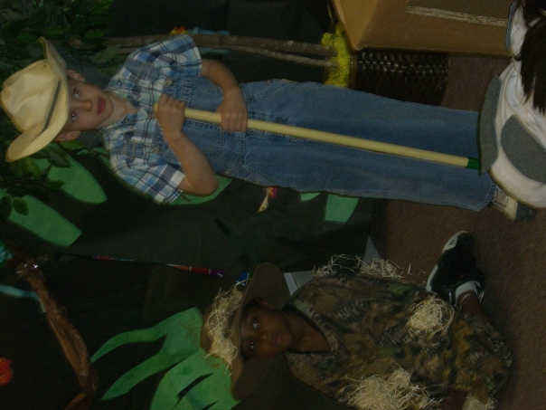 One kid is dressed as a farmer and another is crouching behind him dressed as a soldier.