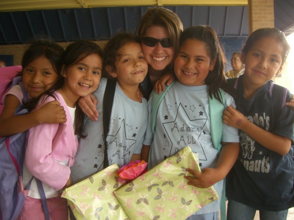 A group of young ladies holding wrapped presents huddle together in a hug.