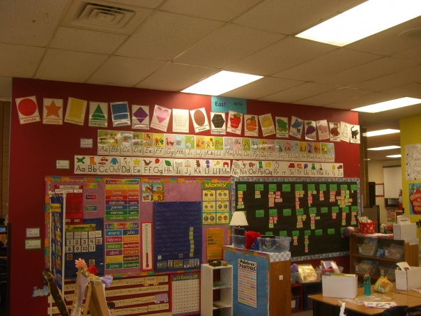a colorful room perhaps a classroom with multiple sticky notes and writings on the walls