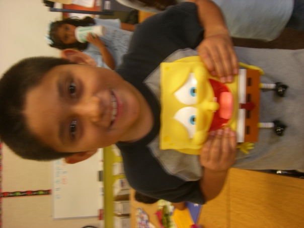 There is a small smiling child holding a SpongeBob SquarePants doll ready to show it off to the world.