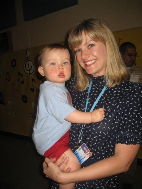 A smiling blonde woman wearing a red dress is holding a small child wearing a blue t-shirt